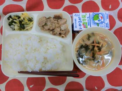 今日の給食は、「豚肉のごまだれ焼き、みそ汁、きくなとはくさいのおひたし、ごはん、牛乳」でした。
