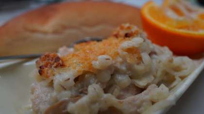 涙が出るほどおいしいのは、いつもの給食。今日の逸品は押麦のグラタン。サクと焦げ目にスプーンを入れ切り分けると硬かった皮から一変ヌルっと柔らかいグラタンの上品な中身に達する。こころにくい調理の技である。はやる気持ちを抑えて口に運ぶと幸せが体中に! さらに、パンの上にのせて頂くとバリエーションが広がりました。