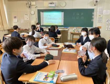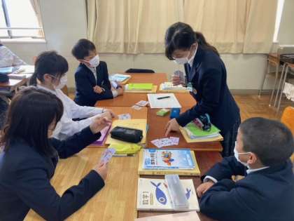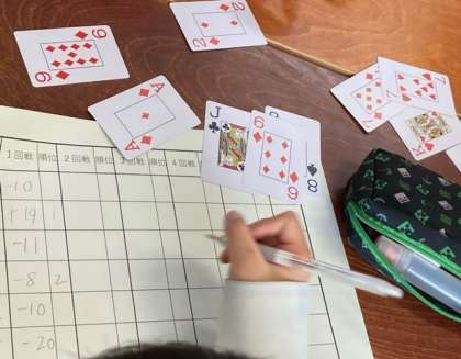 7年生の数学の授業では「正の数 負の数」を学習中。トランプを使って(黒い札は「正の数」、赤い札は「負の数」)、楽しく学んでいました。