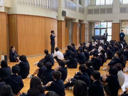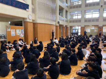 6年生〜9年生は東館のホールで生徒会が司会をし、委員会からの連絡や生徒会からの話もあり、生徒たちが主体的に実施しています。