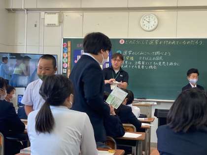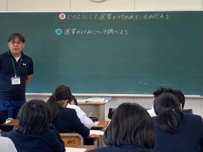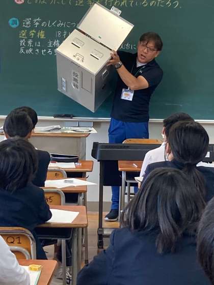 本日、6年生の社会で選挙での投票の仕組みを本物の投票箱(下)、投票用紙(中、本物では無い)を使い勉強しました。