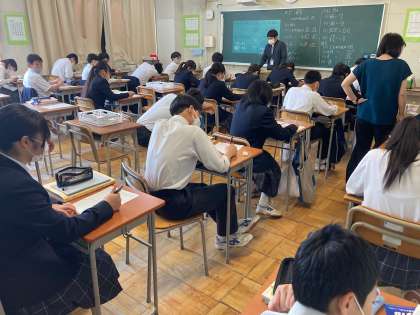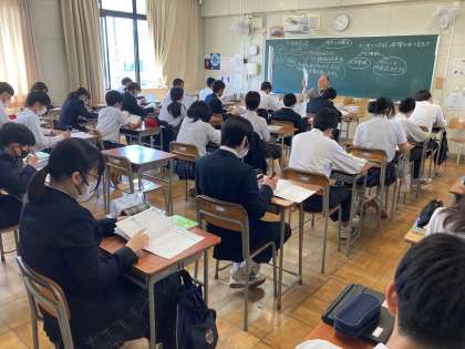9年生は明日から修学旅行ですね。楽しみです。授業風景は(上)社会(下)数学です。