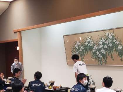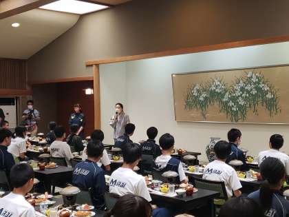 荷物を部屋におき、すぐに食事会場へ。食事の準備が整う間に入館式を行いました。