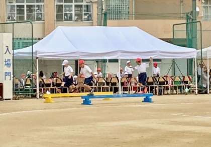 3年生障害走「ゴールを目指せ??いくのファミリー??」 跳んだり走ったり…最後まで頑張れ!