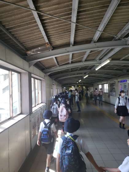 弁天町でJRから地下鉄に乗り換えます。通路の左側にきちんとならんでの移動です。