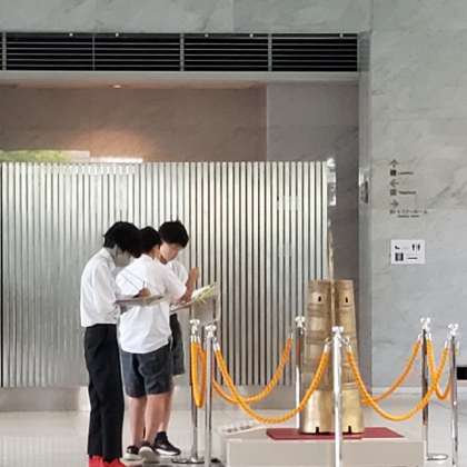 館内の見学です。令和になって作られた銅鐸のレプリカを見ています。
