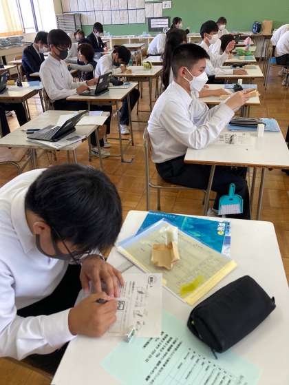 6月14日 水曜日 授業風景3 公開日 2023/06/14 更新日 2023/06/14 お知らせ 9年生の授業の様子です。 (上)美術:篆刻の下書きをしています。 (中)音楽の様子です。 いいね(0)