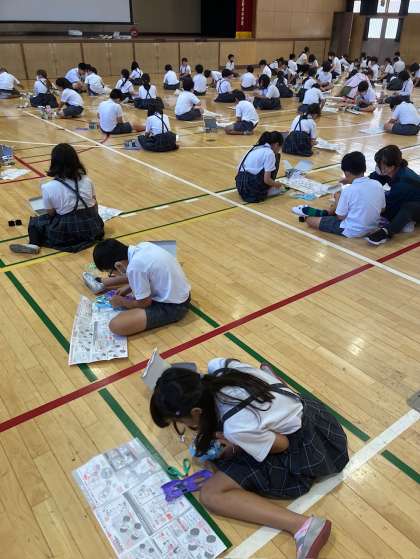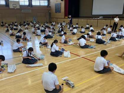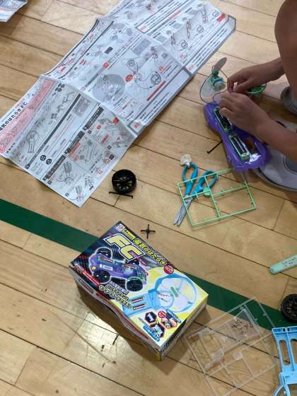 4年生は体育館で理科のモーターカーの制作と、実走を行いました。