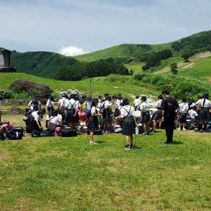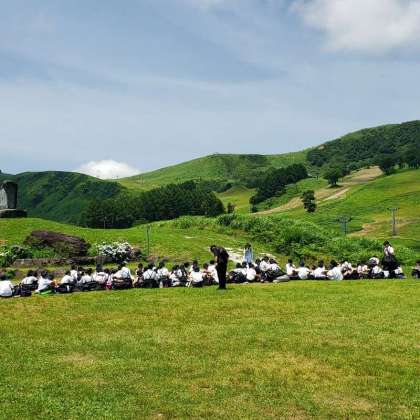 係にお弁当を配ってもらい、諸注意を聞いています。この後、班に別れて昼食です。