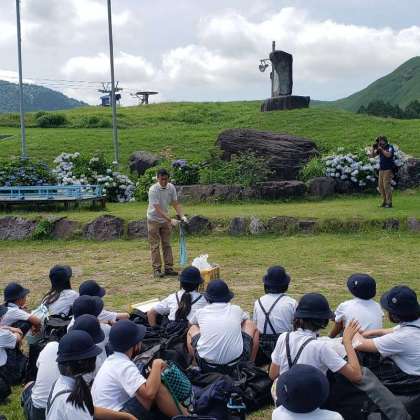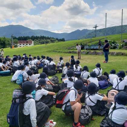 宿舎の方から説明を受けています。板をもらったら、高原で広がって磨きます。
