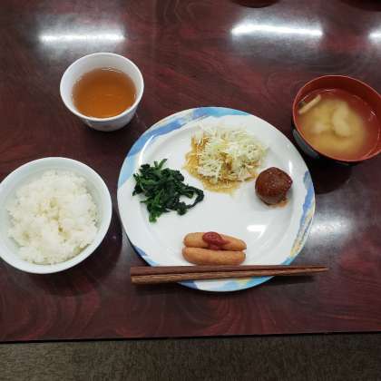本日の朝食です。昨日よりも洋食よりとなっています。味噌汁の具、昨日は豆腐でしたが今日は薄揚げとワカメです。