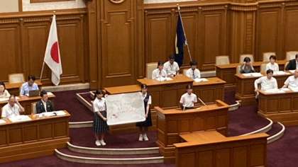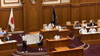 子ども議員1人ひとりが全体にむけて自己紹介をした後に、本校生徒の1名は第3委員会の代表として、市長に直接質問を、もう1名は委員会で作成した説明用の模造紙を掲げるために登壇しました。