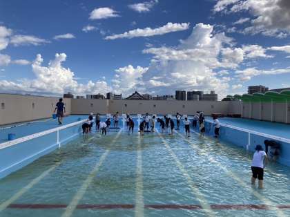 週明けの月曜日から2学期が本格的にスタートします。プール水泳もまとめの1週間となります。教職員で子どもたちが気持よく学習できるように、プールをきれいにしました。来週も暑い日が多いみたいなので、安全に気を付けながら気持ちよくプール水泳学習に取り組んでいきたいと思います。
