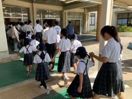 大津波を想定した避難訓練では、全校児童生徒が3階以上に避難。1年生・2年生は、6年生・9年生と手を繋ぎ、一緒に東館の上層階へ避難しました。