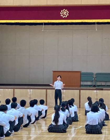 9月15日(金) 9年生の学年集会で、来週行われる「高円宮杯全日本中学校英語弁論大会大阪府大会」に出場する生徒が、9年生を前に英語で発表。