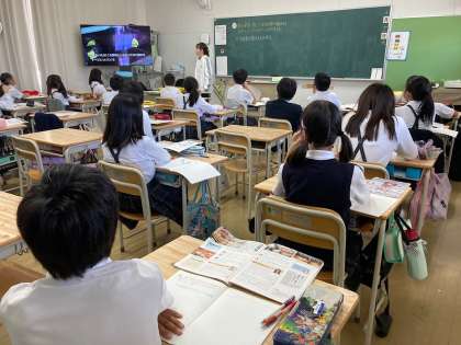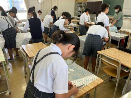 5年生の授業風景ですが、1クラス学級閉業中です。(上)社会、食の安全、安心に対する取り組みはどの様に行われているのだろうか(中)家庭科、エプロン生地の裁断です。