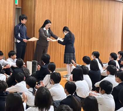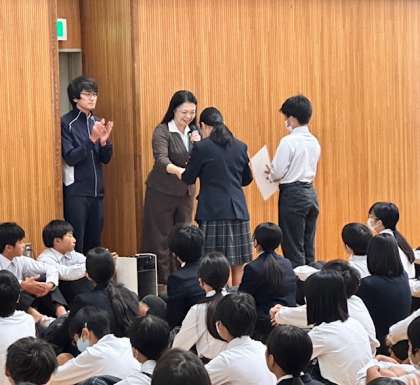 10月16日(月)6〜9年生の全校集会では、「少年非行防止ポスター」に応募した7年生女子1名と、「大阪市英語暗唱大会」に参加した7年生男女1名ずつが表彰されました。