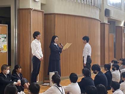 10月23日(月)_全校集会(6〜9年生) 公開日 2023/10/23 更新日 2023/10/23 お知らせ 本日の全校集会では、生野区ジュニア防犯ボランティアの委嘱状を生徒会に渡されました。 今週は文化発表会ウィークです。学級、学年、部活動と力を合わせて、素晴らしいものにしていきましょう! いいね(0)