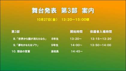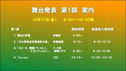 10月27日(金) 第2回文化発表会です。1年生から9年生の児童生徒が協力し、工夫を凝らした舞台発表や作品展示を行います。保護者の皆様、ぜひご来校ください。