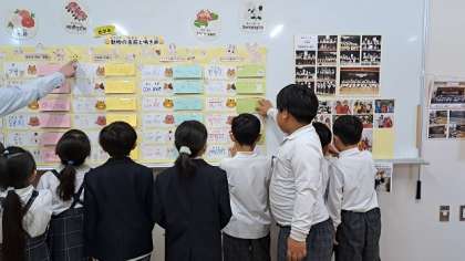 作品を見ながら友だち同士で「ここ見て、すごいで」や「めっちゃきれいにできてる」という声がたくさん聞かれました。自分たちもこんなのを作りたい、あんな風に描きたいという思いが芽生えた様子で、これからの作品作りが楽しみになりました。