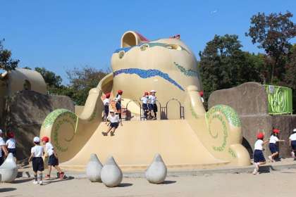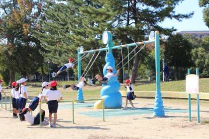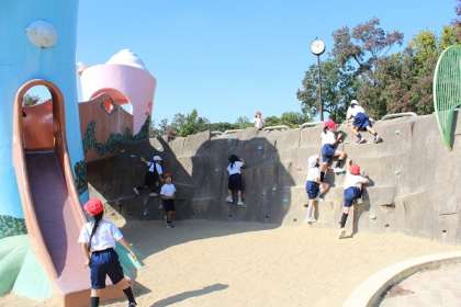 午後からはもう一つの遊具で遊びました。大きくてよく滑る滑り台があったり、ボルダリングのような壁のぼりがあったり、ブランコなどをしました。疲れた様子も見せずに友だちと楽しく遊ぶことができました。