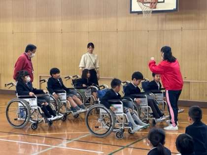 それから、さらに体育館の外に出て介助体験をしました。「楽しそう!」と乗っていた子どもたちでしたが、いざ動かされると自分のタイミングと異なるところで回ったり、動いたり…。