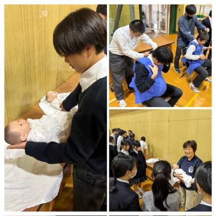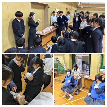 5時間目は助産師さんのお話をお聞きし、6時間目には3箇所のブースで体験学習を行いました。