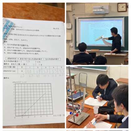 7年生の理科の授業では「力の大きさとばねののびの関係」について・実験を通して関係性について学習中。