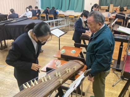 授業探訪(7年生 音楽) 公開日 2024/03/05 更新日 2024/03/05 お知らせ 7年生の音楽の授業の様子です。 音楽の授業では和楽器についても学んでいます。今日は「琴」の実技テストがあるため、その直前練習をしていました。 また、待機の人達は合唱コンクールに向けて、一人一台端末を使って音源を聴きながら、音程の確認をしていました。 【お琴 実技テスト】 ・虫づくし ・姫松 ・さくらさくら いいね(0)