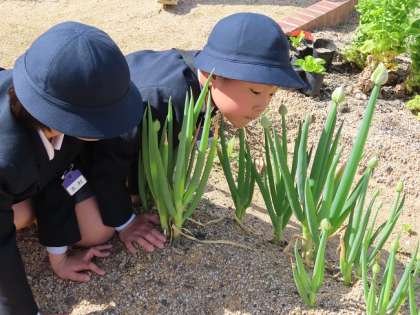 各クラスで校庭に出かけ、いろいろな春を探しました。あちこちから「先生〜、見て〜」「あ、こんなところにも春が…」の声が聞こえてきて、やさしく触ったり、鼻を近づけてにおいを嗅いだりする2年生の姿が見られました。