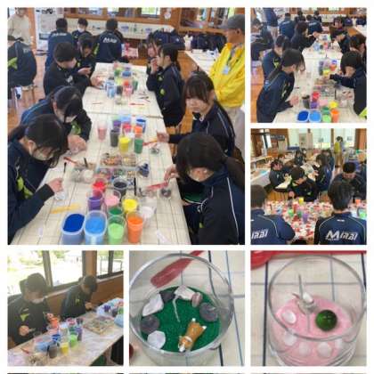 9年修学旅行 選択体験(牧歌の里:キャンドル作り) 公開日 2024/05/10 更新日 2024/05/10 お知らせ ? 9年修学旅行2日目、選択体験「牧歌の里」チームはキャンドル作りを行いました。色のついた砂を土台に、ミニマスコットと貝殻を配置。こちらも、でき上がりが楽しみです。 いいね(0)