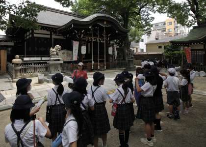 最も古くからの交流を物語る場所は、学校から1.2キロほど離れた御幸森天神宮(みゆきのもりてんじんぐう)。そのあたりでは古代、百済からの渡来人が多く住み、彼らが豚(猪)を飼う技術を持っていたことから「猪飼野」と呼ばれていました。