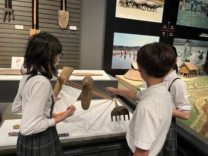 大阪府立弥生文化博物館では、各自でメモを取りながら、資料や映像などを見ました。疑問に思ったことを職員の方に質問している姿も見られ、終始、興味津々な様子でした。当時の洋服を体験できる衣装コーナーでは、「軽い!」「涼しい!」などと言いながら、楽しく体験していました。