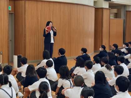 6月10日月曜日、6〜9年生の全校集会において、大阪エヴェッサ・山本精工さんより寄贈いただいたバスケットボールの紹介を行いました。先週、8年生の職業講話にも来ていただきました。ありがとうございます。部活動や体育の授業で使わせていただきます。