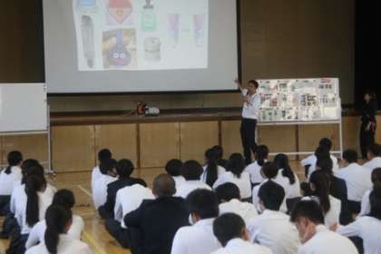 生野区の「生きるチカラまなびサポート事業」として行われたもので、タイトルは「世の中をよろこビックリさせる仕事」。生徒たちは、同社の製品で思いつくものを尋ねられると、地元有名企業とあって次々に商品名を口に出していましたが、医薬品から化粧品、健康食品まで幅広い分野で積極的に商品開発を進めているほか、近年は再生医療の研究にまで取り組んでいることを知らされ驚いていました。