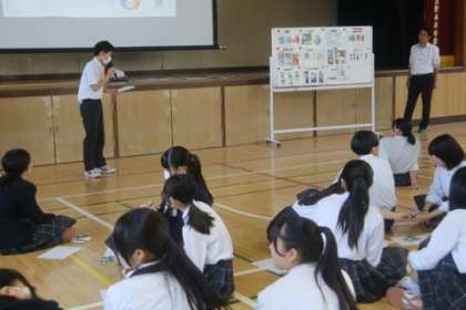 9年生が6月14日(金)、体育館でロート製薬(本社・大阪市生野区)の社員3人による出前授業を受けました。