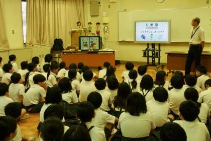 講師は大阪府中央少年サポートセンター職員。子どもたちは、小学5年の男の子がコンビニでまんが本を万引きして補導され両親を悲しませるストーリーの人形劇を通して、心にブレーキをかけることの大切さを学びました。