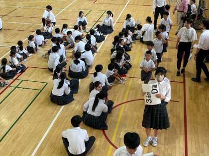 地区別班は4地区計22班。この日の5時間目、全地区別班の9年生のメンバーが自分の班の1・2年生を教室まで迎えに行き東体育館に集まったあと、各班に集合場所として割り当てられた教室などに移動しました。各集合場所では、自力で移動してきた3年〜8年生も含めて全員で自己紹介し合って顔ぶれを確認しました。
