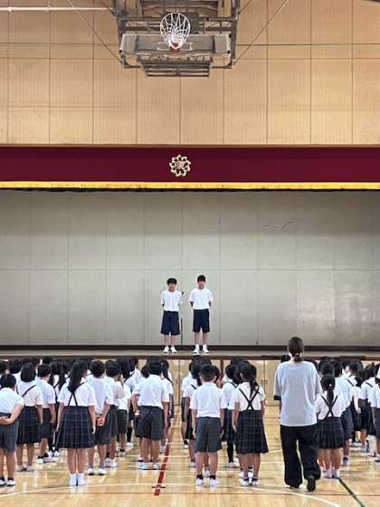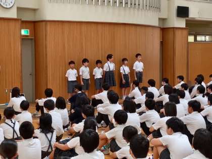 1〜5年生の全校集会で生徒会役員が、6〜9年生の全校集会では児童会の運営委員会の児童たちが、共に「あいさつ運動」をすることを知らせ、「大きな声で挨拶してください!」と呼びかけました。これは、前期課程・後期課程の生徒会・児童会が一緒になっての取組です。