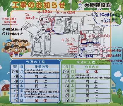 本校における今週(7月8日〜14日)の工事の内容は「工事のお知らせ」=写真=のとおりです。