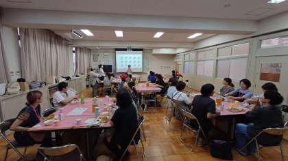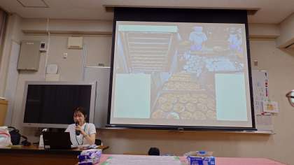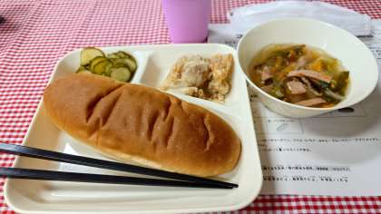 この日の献立は「鶏肉のからあげ、ハムとはるさめのスープ、きゅうりの中華あえ、黒糖パン、牛乳」でした。大阪市の給食についてや給食室のお話をして、牛乳パックの開け方もみなさんで実践してみました。給食室にクーラーがないことをお話しするとみなさん驚かれていました。おうちでも子どもたちと給食の話をしていただけたらと思います。