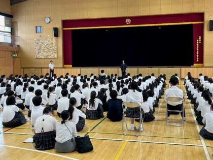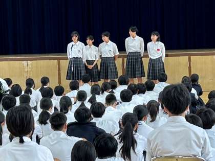 岡准校長先生は「学びは未来に羽ばたく翼(つばさ)。夏休み中、勉強でも部活でも習い事でも何でもいいので学びを続けてほしい。それが君たちを成長させる翼になる」などと話しました。生徒指導の先生からは、ルールを守り楽しい夏休みにしようとの呼びかけがありました。