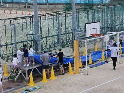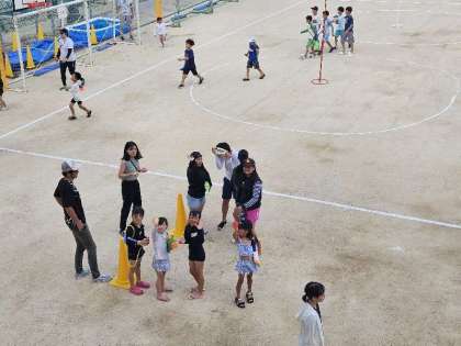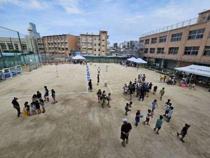 PTA夏のイベントは、昨年のウォーターバトルに引き続き、今年も水がテーマで、その名も「いくみら水都祭」。バトルコーナー、水風船玉入れコーナー、スライダーコーナーなど様々なブースがあり、いたるところで子どもたちの声がこだましています。