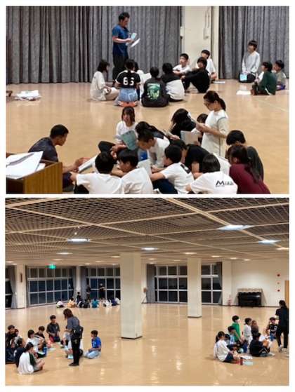 楽しいレクリエーション大会も終わり、係別会議の後、入浴の合間に、クラスごとに集まり、補食のパンとスポーツドリンクを取ったり、しおりに1日の振り返りを書いています。その後、就寝となります。