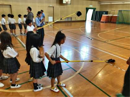 「ホームから人が線路に落ちた時の対処法は?」の正解は「ホームの非常ボタンを押して危険を知らせる」ですが、次のコーナーで子どもたちは模型を使って非常ボタンを押すことを体験。続いて行われた、線路上に落ちた帽子や傘などをキャッチャー(長さ約3m)でつかみ取る体験にも楽しそうに取り組んでいました。