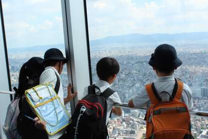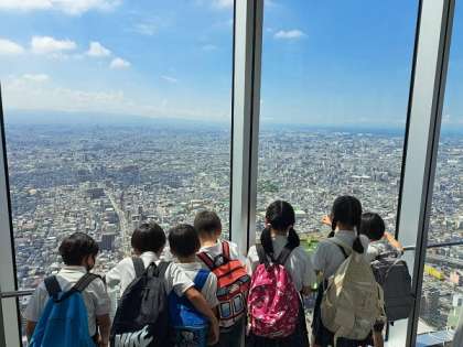 あべのハルカスでは、エレベーターが上がっていくスピードに歓声や驚きの声があがっていました。展望デッキでは、大阪市を360度見渡すことができ自分たちの学校や馴染みのある施設を見つけて意欲的に取り組むことができていました。