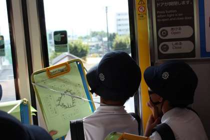 環状線一周では、東西南北それぞれの担当をグループの中で決め、各方角にどんな建物が多いかをしっかりと調べていました。有名な建物が見えた場面では、子どもたち同士で嬉しそうに共有していました。