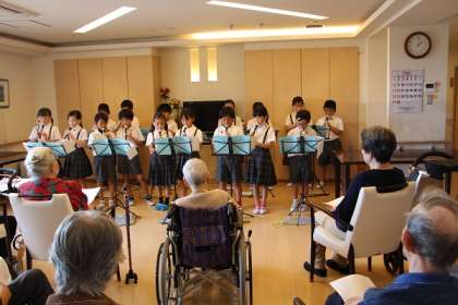 今回のグループは舎利寺地区にある「ファイン舎利寺」さんへ行き、そこにいる高齢者の方に歌やリコーダーを披露したり、一緒に手遊びをしたり、自分たちが聞きたいことをインタビューしたりしました。