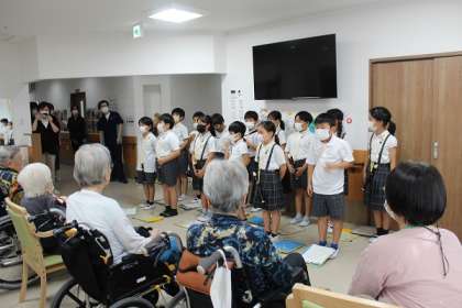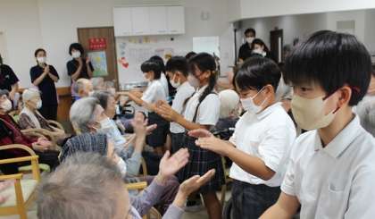 3年生 IKUNO未来科の学習 公開日 2024/10/02 更新日 2024/10/02 お知らせ IKUNO未来科の学習で老人福祉施設へ3年生が訪問しました。 今回のグループは西生野地区にある「あいおい生野西プラス」さんへ行きました。 始まる前はとても緊張した様子の子どもたちでしたが、利用者の方と手遊びで触れ合う際には笑顔があふれて、楽しく交流することができました。最後には歌のアンコールがあり、利用者の方も職員の方も踊りながら一緒に歌ってくれている姿もありました。 いいね(0)