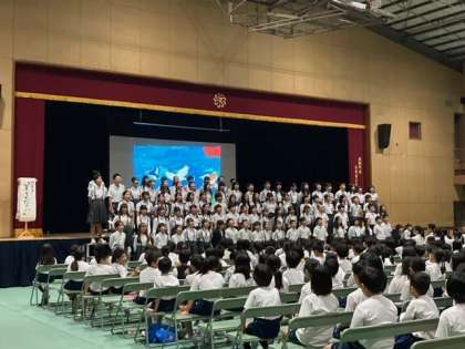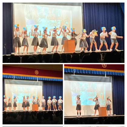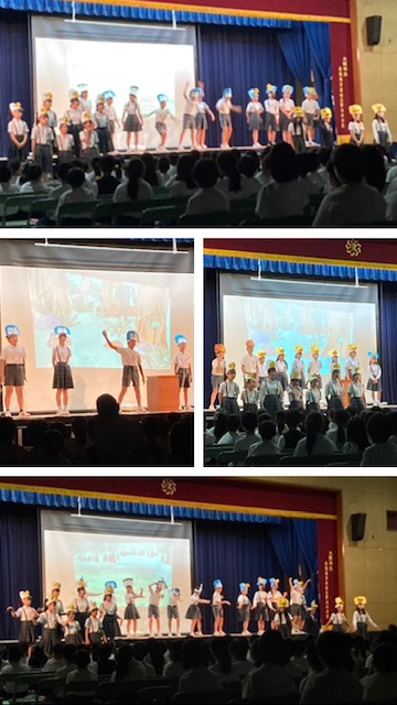6年生の学年劇「翼をください」。今年の6年生は「やればできる。無限の可能性!」を目標に、何事にもあきらめずに挑戦しようと日々取り組んでいます。自分の夢に向かって頑張る姿を、様々な鳥となって演じました。
